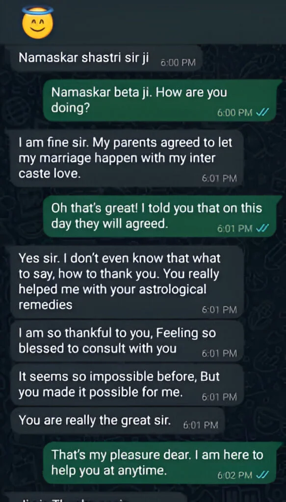 Hello I'm from the United States, and my name is Sabrina. I love somone and want to marry him, but my parents are strongly against it because of intercaste issues. I tried a lot of astrologers to find a solution, but they only took my money. Eventually, I saw an astrologer named Karan Shastri Ji, who helped my parents change their minds, and I am now happily married to my partner. I sincerely appreciate your help, Guru Ji. I will suggest his services to anyone having issues in their marriage or love life. Thanks Again Swami Ji.