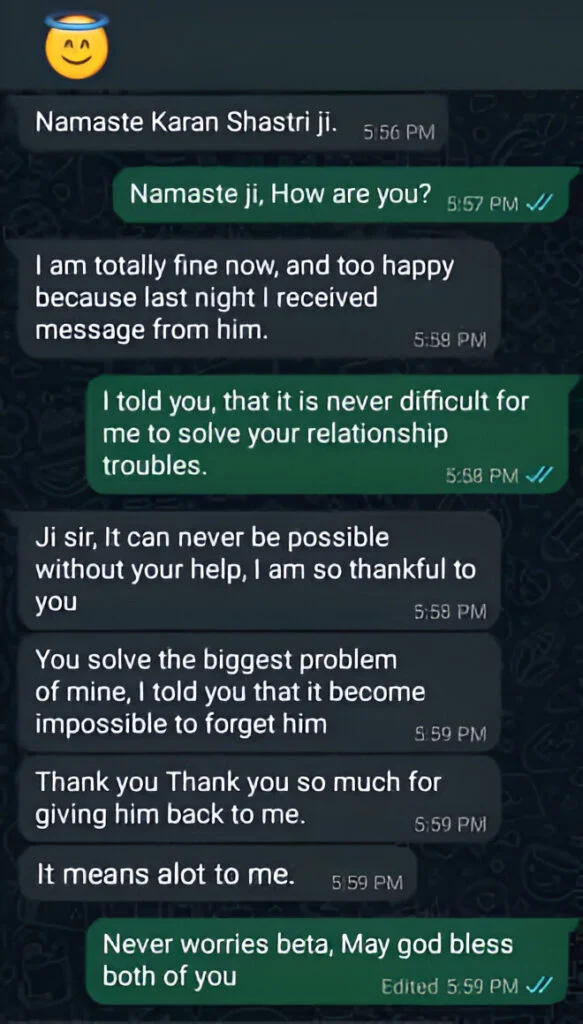 Hello I'm Neetu Chopra, originally from Uttarakhand, and I currently reside in the United Kingdom. I am grateful to Astrologer Karan Shastri Ji for his assistance in resolving my love life issues. I am able to bring love and serenity back into my life because of you, and your suggested remedies have truly helped me build a sense of understanding and trust in my relationship. I sincerely appreciate your help, Guru Ji. I will suggest his services to anyone who is having relationship issues. Thanks Again Baba Ji.